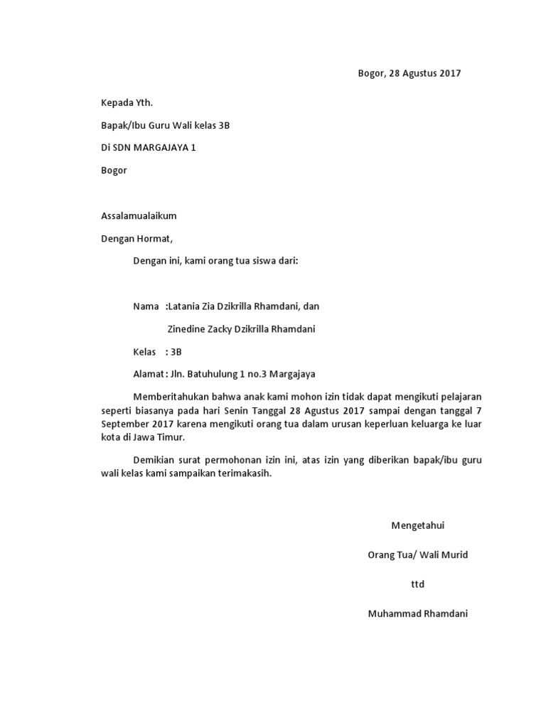 Dengan ini bermaksud memberitahukan jika saya harus mengikuti kegiatan pelatihan di kantor dinas pendidikan kota medan selama 3 hari, terhitung mulai. Yha walaupun hal ini masi bergantung pada. Contoh surat izin sekolah karena urusan keluarga. Semoga bermanfaat buat anda yang ingin tidak masuk kerja bisa jadi karena sakit, acara keluarga, maupun alasan lainnya. Berikut ini cara menulis surat izin dan juga contoh surat izin tidak masuk sekolah, tidak masuk kuliah, tidak masuk kerja, surat izin dari orang tua 2.2 contoh surat izin sekolah karena urusan keluarga.