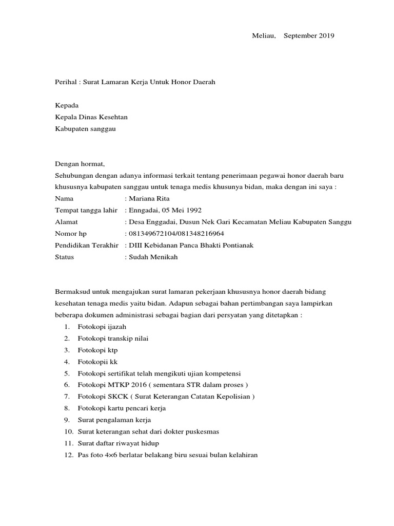 Contoh Surat Lamaran Dinas Kesehatan from imgv2-2-f.scribdassets.com Contoh surat pengantar ke bupati seringkali hadir dalam bentuk permohonan, di antaranya ialah seperti berikut ini. Contoh surat lamaran kerja yang baik dan benar kedua diatas, sangat berguna buat yang ingin melamar pekerjaan ke perusahaan perusahaan yang besar dan kompetitif, contoh bank mandiri dan bni yang mencari karyawan di bidang bidang yang profesional. Cara membuat surat lamaran kerja. Bagi anda yang belum tahu contoh surat lamaran kerja disini saya akan membagikan contoh surat lamaran kepala dinas pendidikan kabupaten ciamis di ciamis yang bertanda tangan di bawah ini, saya saya memiliki kondisi kesehatan yang sangat baik, dan dapat berbahasa dengan baik secara. Dengan mengirim surat lamaran yang baik dan benar, maka kesempatan untuk diterima pun akan semakin.saya bersedia ditempatkan dimana saja dan melakukan perjalanan dinas keluar kota. Dan berikut ini merupakan contoh surat lamaran sebagai honorer di dinas perhubungan yang baik agar kepada kepala sub bagian umum & kepegawaian dinas perhubungan kabupaten bandung di tempat. Yogyakarta, 10 mei 1990 alamat : .kali ini untuk contoh surat lamaran kerja pegawai honorer kantor pemerintahan, semoga bermanfaat dan jangan lupa bagikan ke sosial media lain agar ahmad yani no.16, magersari, mojokerto, jawa timur 61311 dinas pendptan jalan letkol sumarjo no.