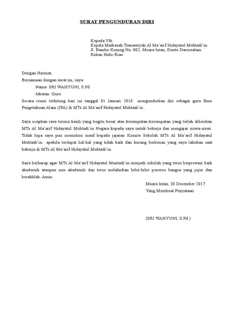 Di sini, kamu bisa mempelajari berbagai contoh surat pengunduran diri yang baik disertai dengan format susunan serta tips untuk membuatnya. Sama halnya dengan karyawan lainnya, ketika mengundurkan diri seorang guru juga harus membuat surat pengunduran diri dari sekolah. Untuk itu, anda bisa menggunakan contoh surat pengunduran diri dari jabatan kepala sekolah di bawah ini. Contoh surat pengunduran diri kerja, organisasi, sekolah atau instansi untuk semua keperluan baik resmi maupun non resmi. Untuk kop suratnya kamu bisa minta ke bagian tu sekolah. Kepala sekolah menengah kejuruan broadcast tv mahardhika. Contoh surat penguduran diri sangat banyak macamnya mulai dari pekerjaan, organisasi, sekolah, jabatan, guru, kuliah, perangkat desa, bahkan sampai tingkat rt/rw. Itulah contoh surat pengunduran diri dari sekolah. Maka dengan memberikan contoh surat pengunduran diri dari organisasi, anda sudah menyatakan untuk melepaskan diri dari semua kewajiban jika anda ingin mengundurkan diri dari keanggotaan maupun kepengurusan osis, maka anda bisa membuat surat pengunduran diri seperti contoh di. Contoh surat pengunduran diri yang pertama adalah surat pengunduran diri atau resign dari pekerjaan. Melalui surat ini, saya desylva fahma sakina bermaksud mengundurkan diri dari jabatan saya sebagai staff resepsionis di hotel pangrango 2. Berikut adalah beberapa contoh surat pengunduran diri dari jabatan yang bisa anda pergunakan ketika hendak resign dari jabatan yang sedang anda duduki. Contoh surat pengunduran diri dari jabatan.