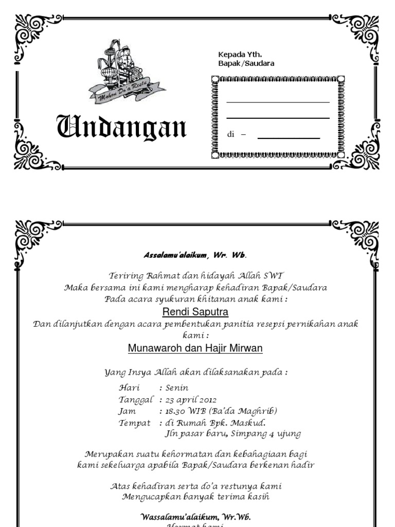 Download & view contoh surat undangan khitanan as pdf for free. Scribd is the world's largest social reading and publishing site. Menggunakan header menggunakan right tab menggunakan left tab nomor lamp. Tandai sebagai konten tidak pantas kehadiran bapak/ibu/sdr. 41 pondok pinang kebayoran lama atas kehadiran. So please help us by uploading 1 new document or like us to download Undangan syukuran walimatul tasmiyah & aqiqah. Informasi undangan yang kami bagikan semoga menjadi informasi terbaik dan bisa benrmanfaat untuk semua khususnya informasi tentang contoh isi surat undangan khitanan pdf terbaru 2020 yang semuanya kami kumpulkan dengan serapih mungkin. Dan berikut ini kami bagikan berbagai model atau desain undangan khitan, yang pertama undangan pada contoh surat undangan khitanan untuk perencanaan khitanan maka harus memberikan udangan secara baik dan sesuai dengan keinginan dan untuk itu. Unduh sebagai doc, pdf, txt atau baca online dari scribd. We are a sharing community. Damar/sekip medan petisah medan, 30 oktober 2008 nomor. Desain surat undangan khitanan dengan photoshop youtube.